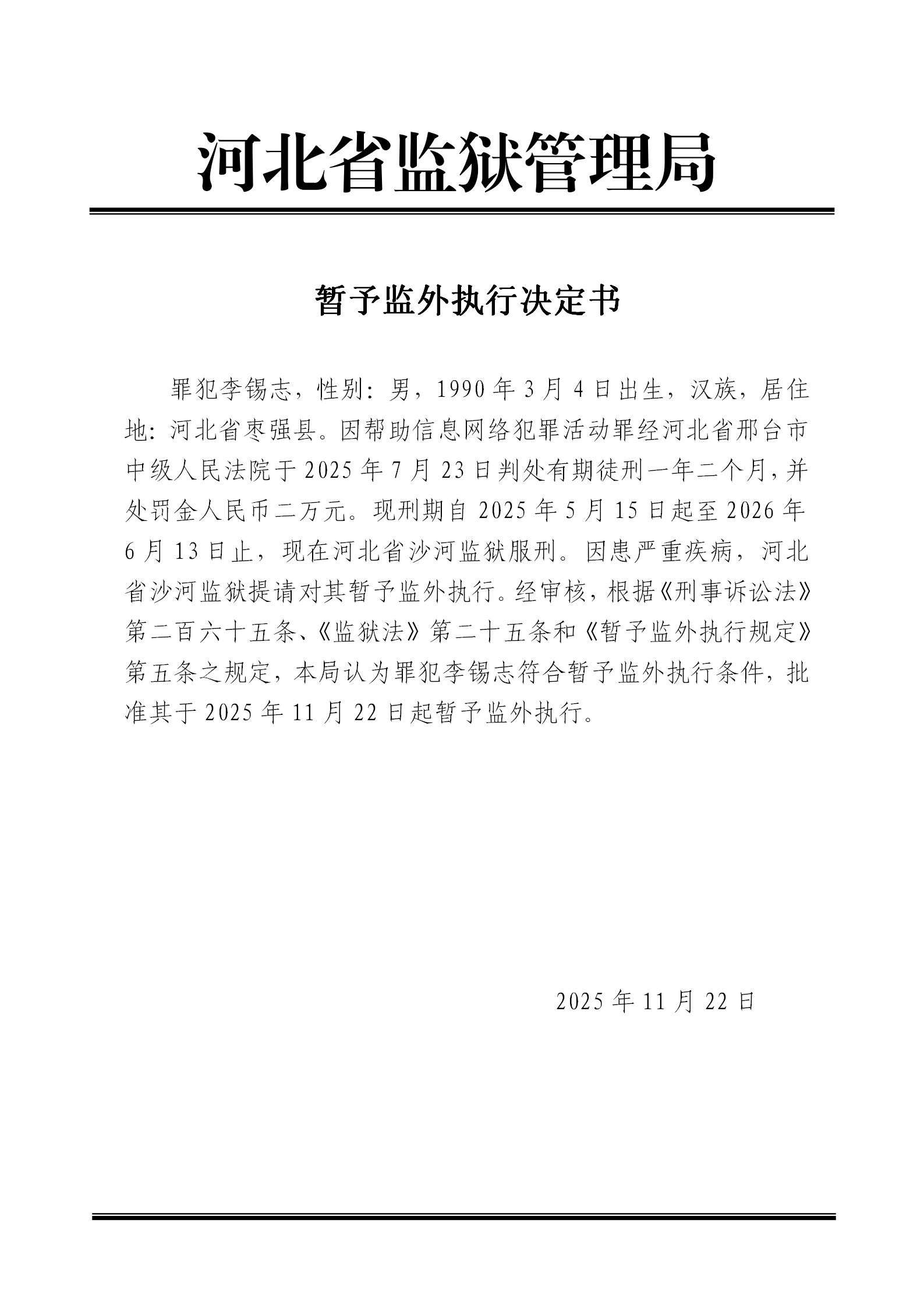 2025年12月河北省监狱管理局1名罪犯暂予监外执行决定书