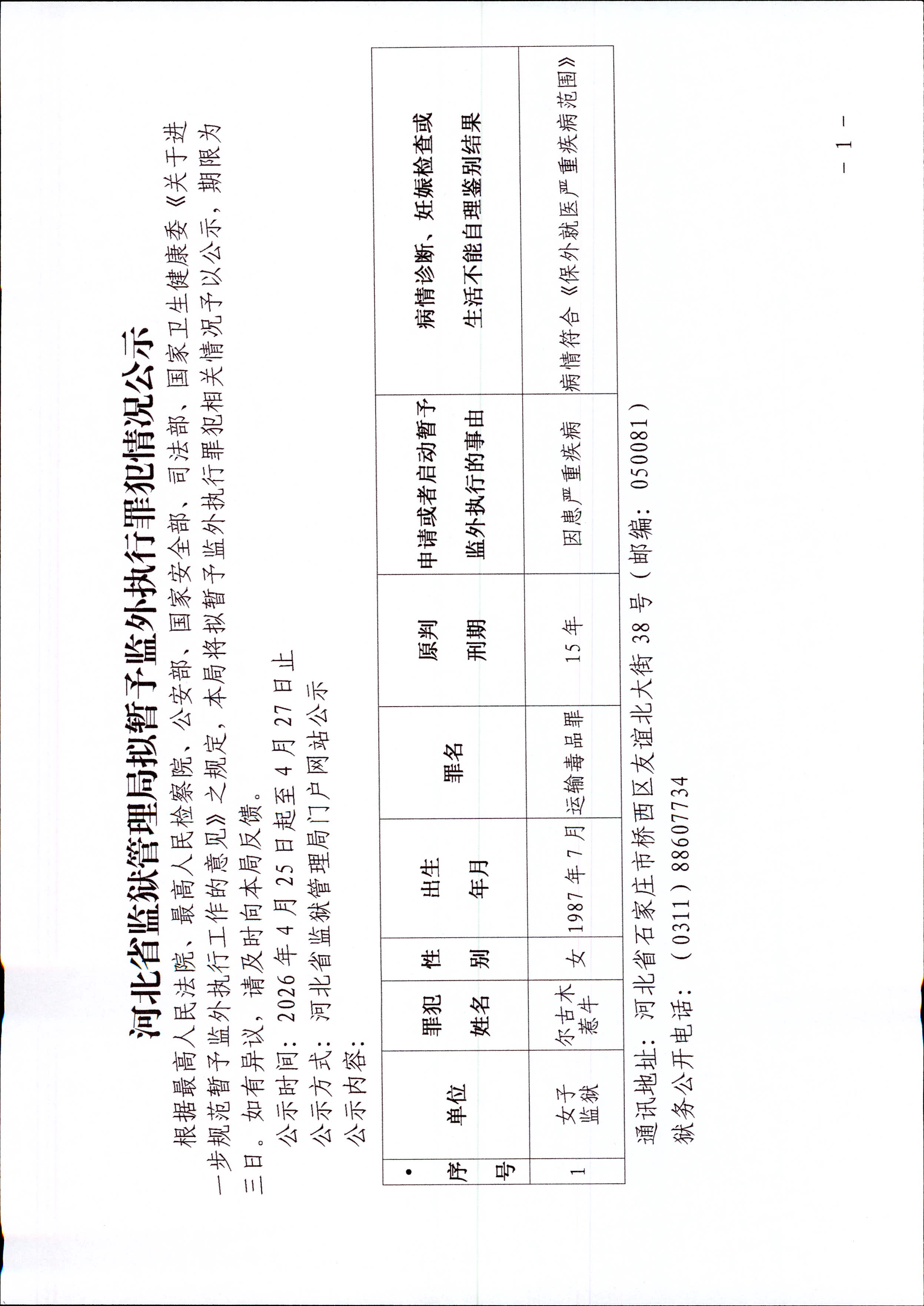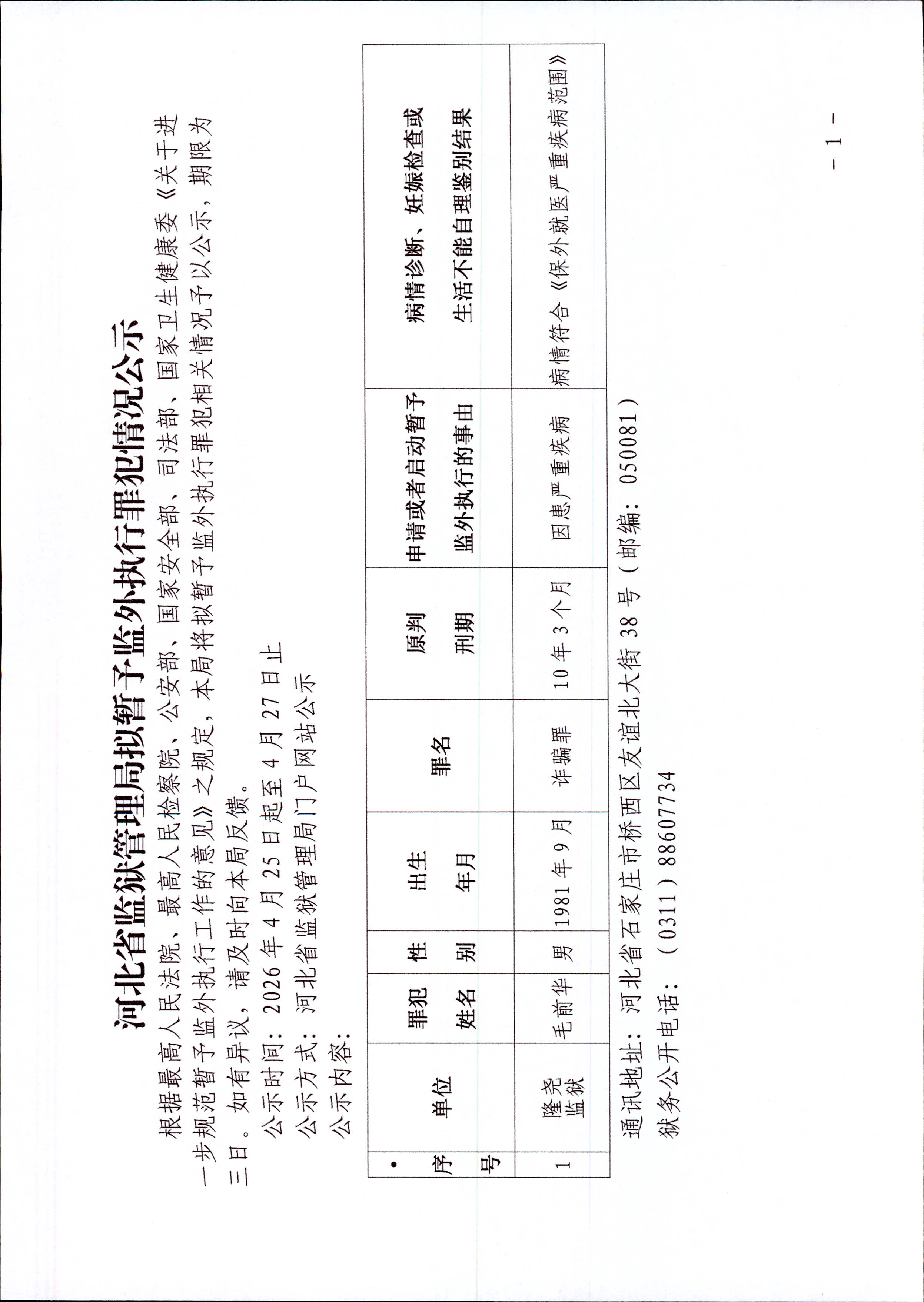 2026年4月25日至27日河北省监狱管理局拟暂予监外执行罪犯情况公示