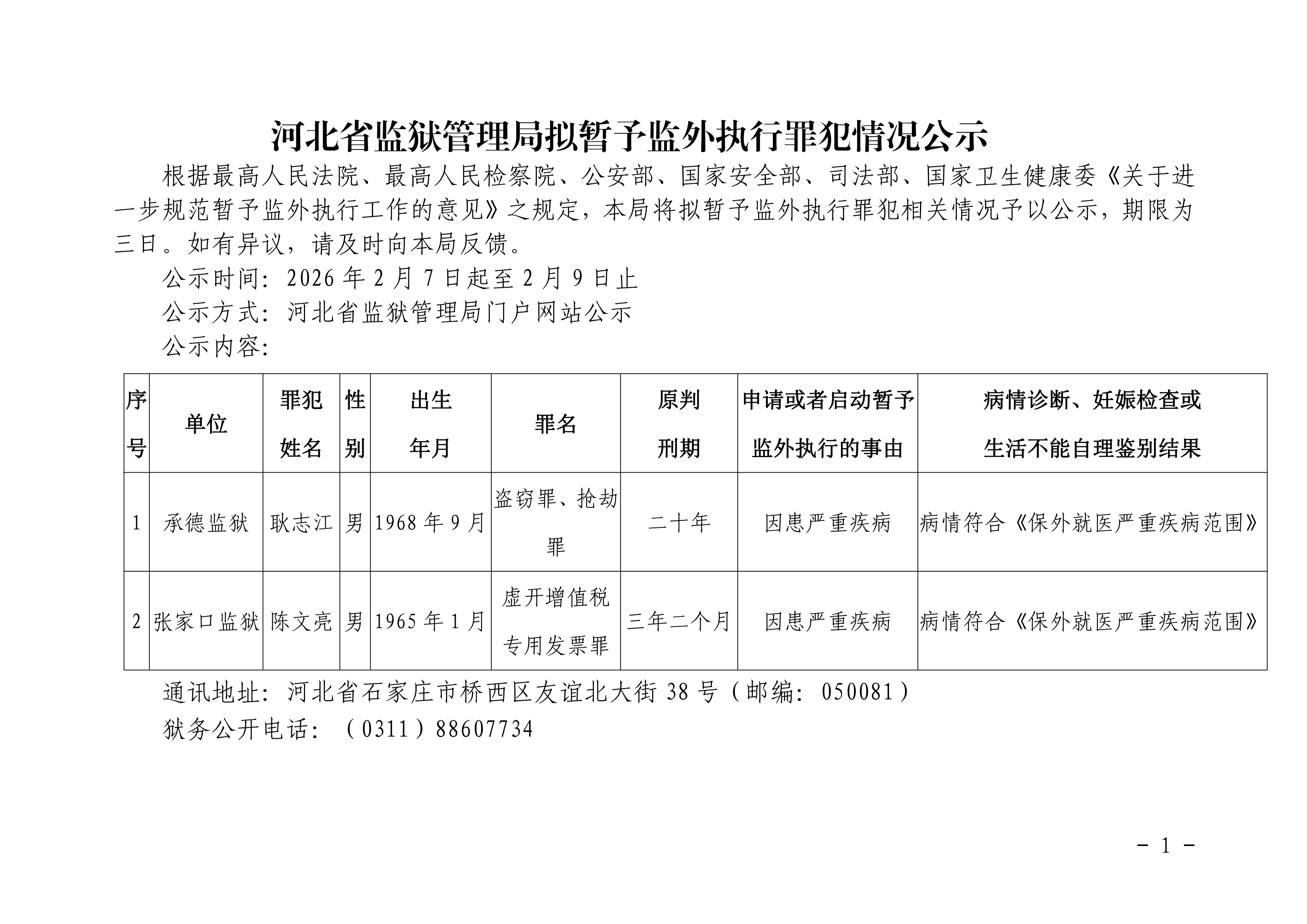2026年2月7日至9日河北省监狱管理局拟暂予监外执行罪犯情况公示
